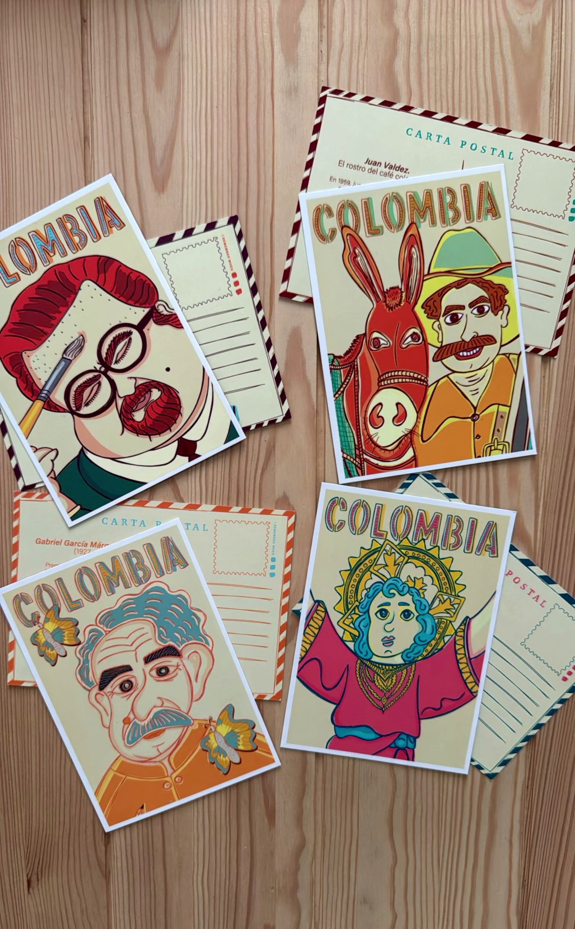 Este set de postales colombianas reúne los íconos más queridos de Colombia en un solo paquete. Cuatro ilustraciones originales hechas a mano que celebran nuestra cultura, arte y tradiciones. El souvenir perfecto de Colombia para enviar o coleccionar.