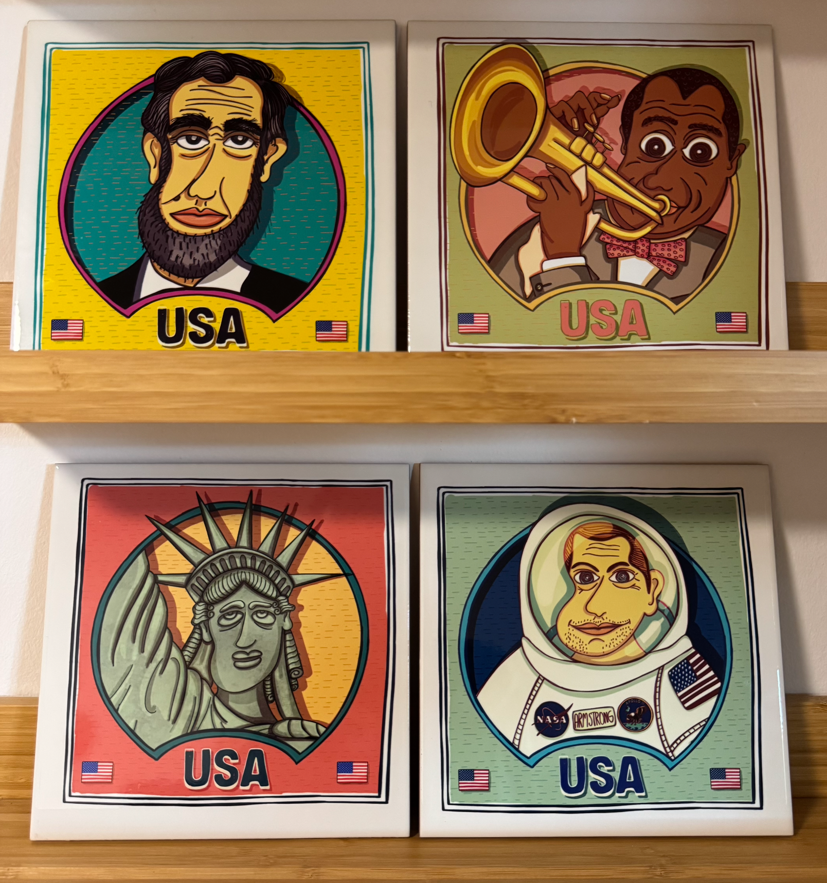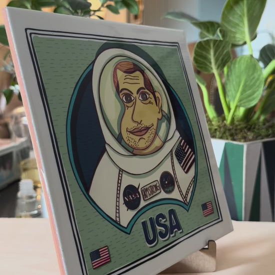 Este azulejo decorativo rinde homenaje a Neil Armstrong, el astronauta que dio el primer paso en la Luna. Una ilustración original hecha a mano que celebra la exploración espacial americana. El souvenir espacial perfecto de USA.